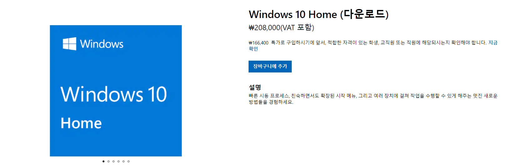 MS스토어에서는 윈도우10 home 버전이 208000에 판매되고 있습니다.