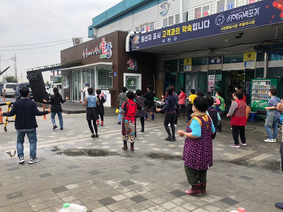 서천특화시장에서는 가을 부터 아침 9시에 놀장 방송국 앞에서 아침 신바람 체조를 진행하고 있습니다.
