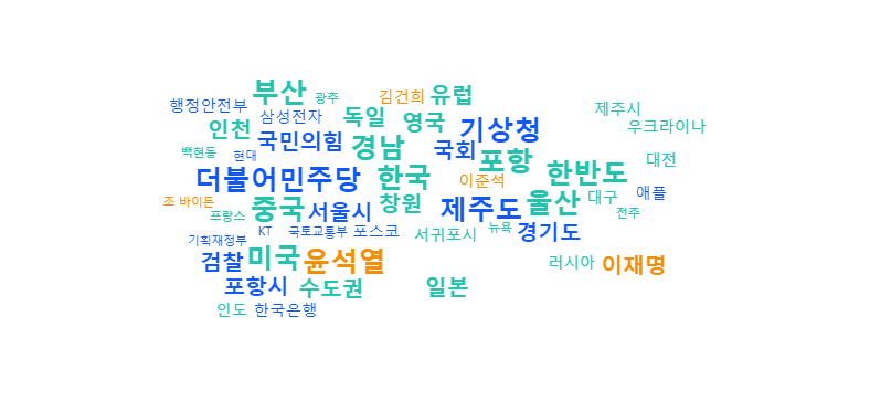 기상청, 부산, 제주도, 포항, 한반도, 창원, 서귀포시, 이 부분의 키워드는 아무래도 태풍피해가 큰 곳이다 보니 관련 기사도 많이 발행된 것으로 보인다.