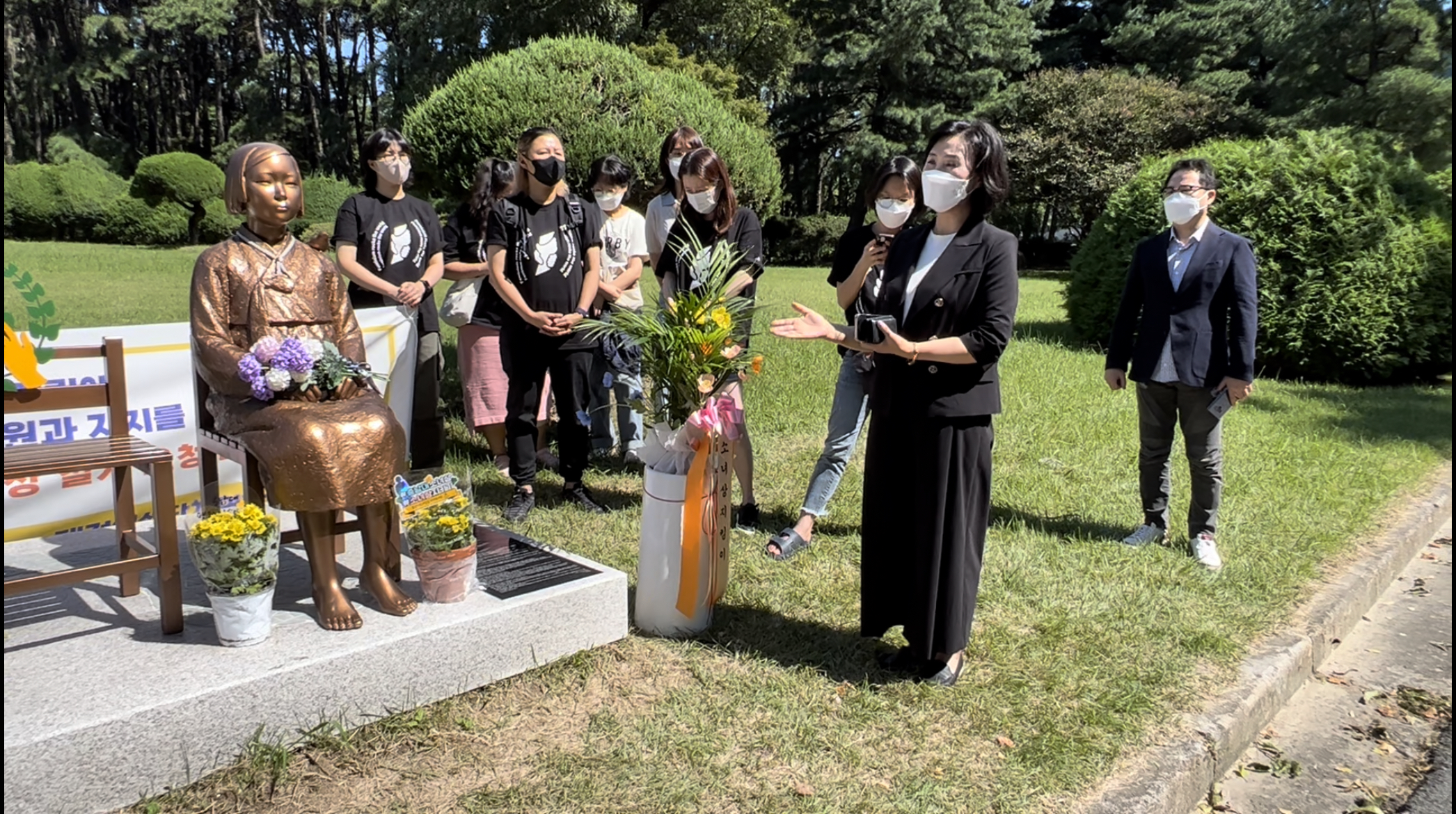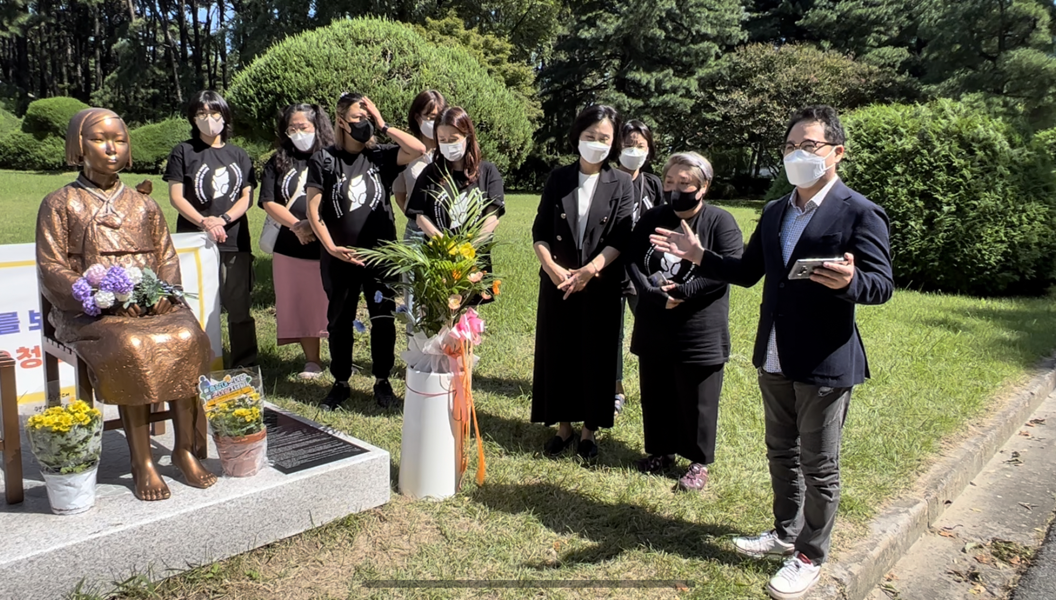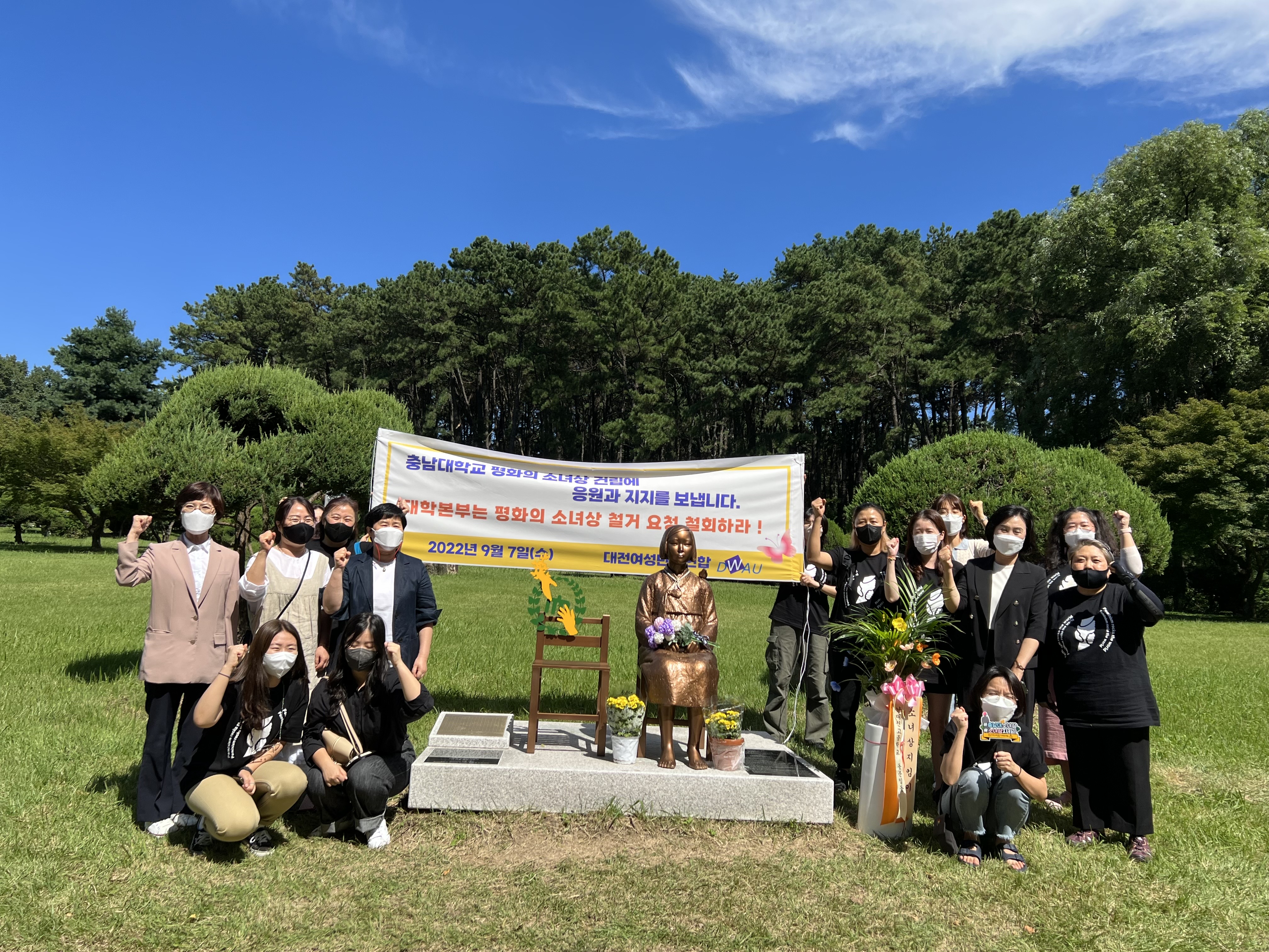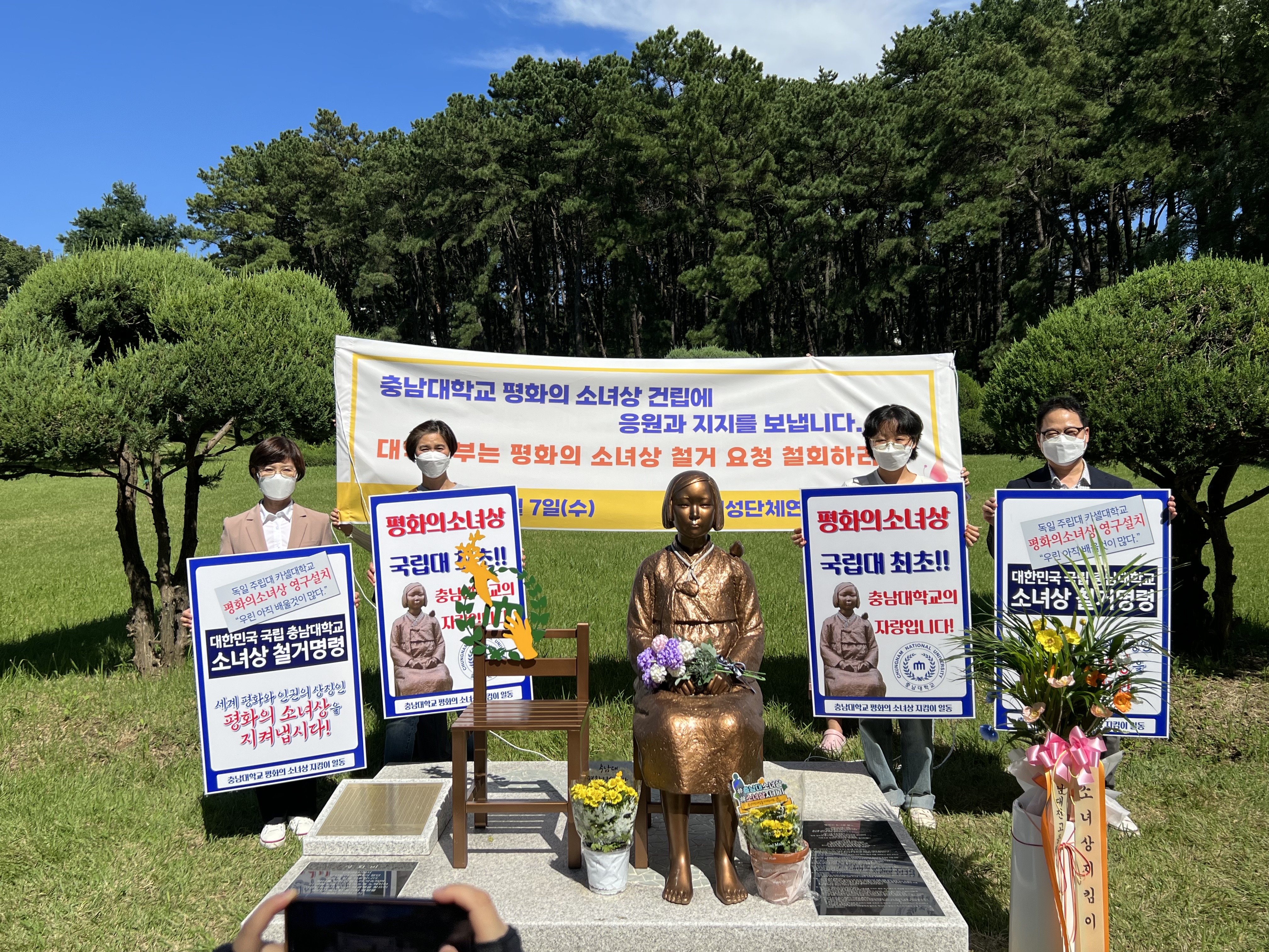 9월 7일 충남대학교 평화의 소녀상 건립 위치에서 대전여성단체연합이 충남대학교 대학본부의 평화의 소녀상 철거 요청을 규탄했다.