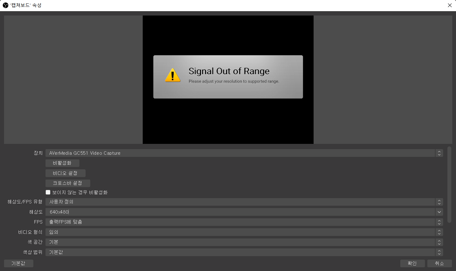 해상도를 바꾸어 보는데도 오류 메세지가 계속 뜨게 되는 경우 캡쳐보드와 OBS 노트북과 연결된 USB를 분리했다 연결..