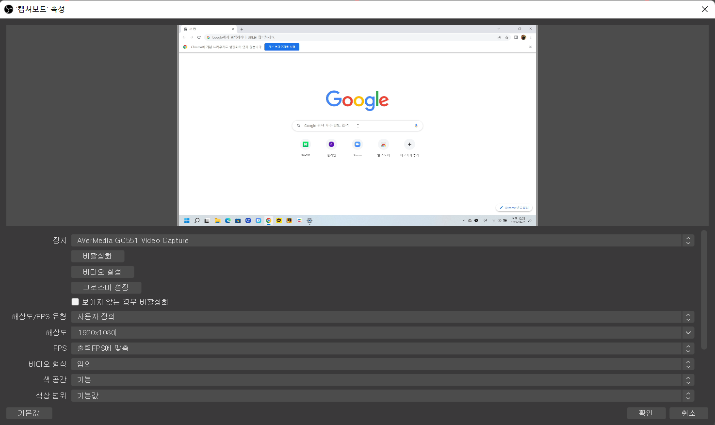 비디오캡쳐 속성에 해상도를 변경 체크해야 함