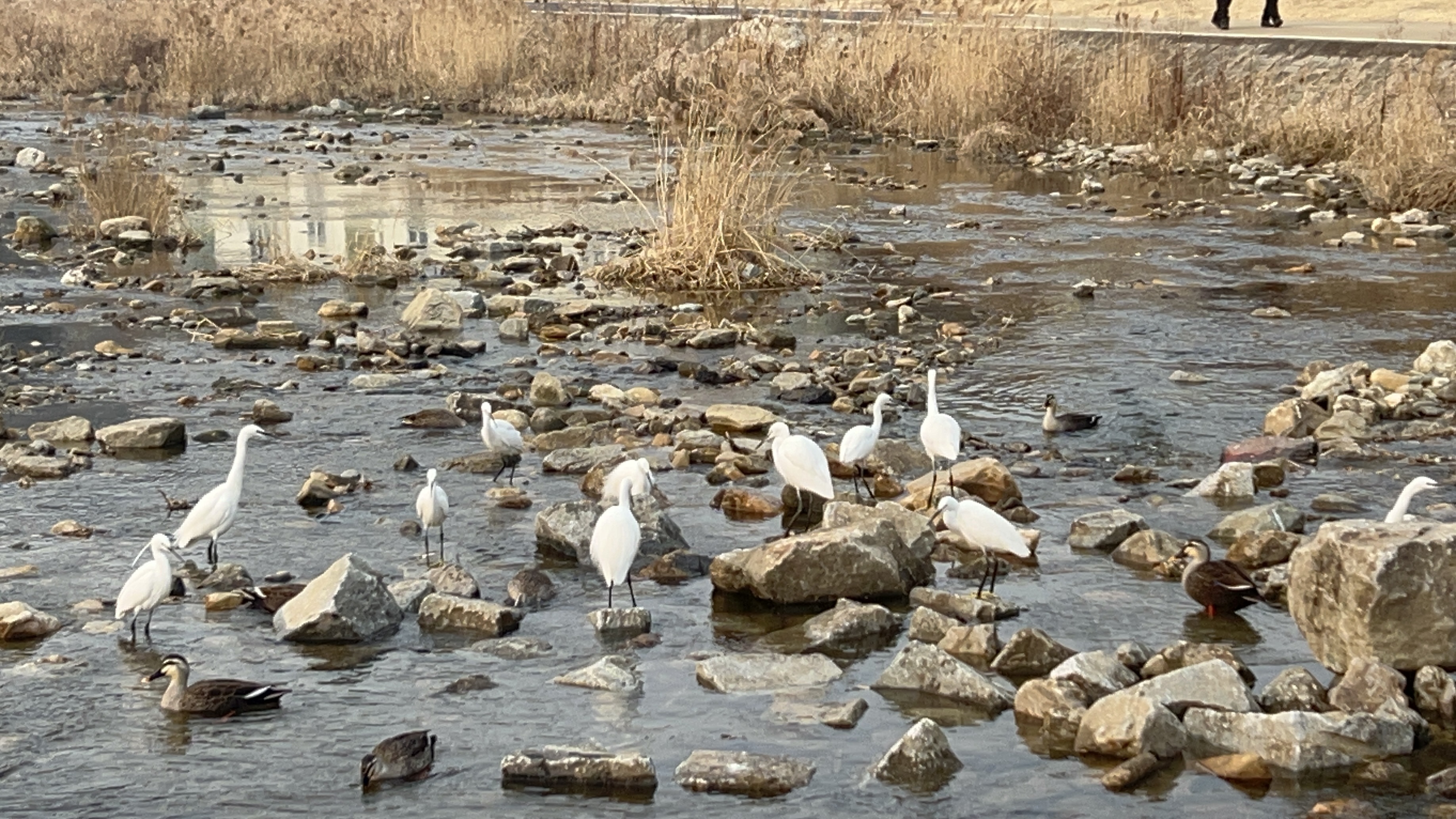 날이 풀린 점심 무렵 백로, 오리 가족들이 대전천 징검다리 아래에서 사냥을 하고 있습니다.