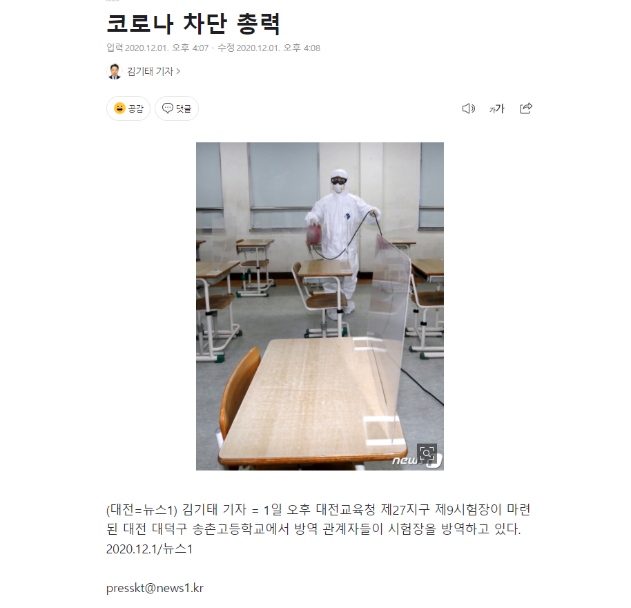 (대전=뉴스1) 김기태 기자 = 1일 오후 대전교육청 제27지구 제9시험장이 마련된 대전 대덕구 송촌고등학교에서 방역 관계자들이 시험장을 방역하고 있다. 2020.12.1/뉴스1 presskt@news1.kr ▶ 네